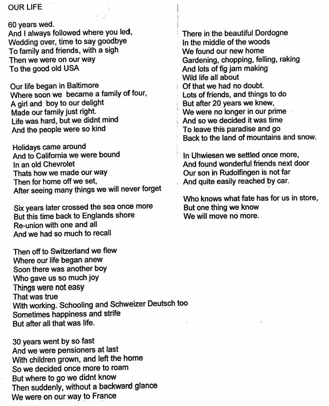 This new section is aimed at helping us get to know each other that bit better. What I’m asking of you, is to tell us something about yourself. Shouldn’t be difficult really, as we must know ourselves quite well by now. The difficulty is not what to write, but what to leave out. It could be a kind of life story. So, limiting it in length makes it quite challeng-ing. So, here is the challenge: a single A4 page plus, if you wish, a photo or two telling us a little about yourself or you and your partner, events that were for you important, amusing or tragic, whatever you would be prepared to share with the rest of us. If you would be more comfortable writing in German, then I would happily translate that for you. I look forward to your response. Here are a couple of contributions to get you all started. Other contributions will follow.